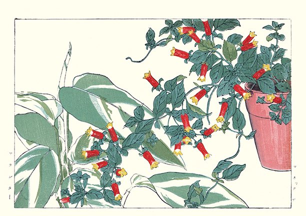 73 Prayerplant (Maranta leuconeura) and firecracker vine (Manettia luteorubra)